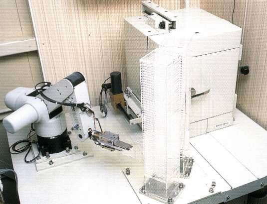 試料の微量放射線を測定する装置です。自然界にある放射線をさえぎる遮蔽体に鉛が使用されています。写真の装置は試料を自動的に交換するロボットが組み込まれています。